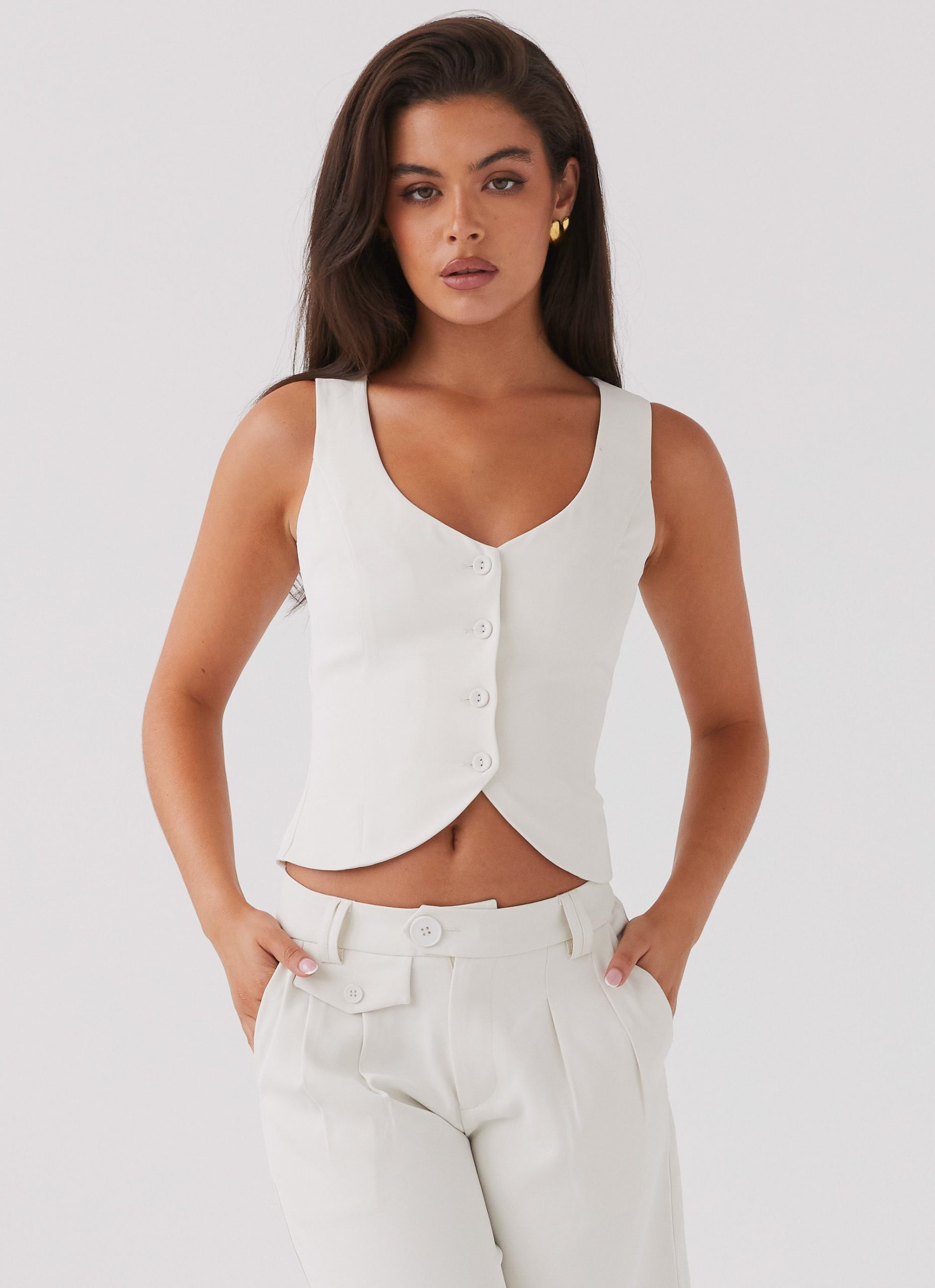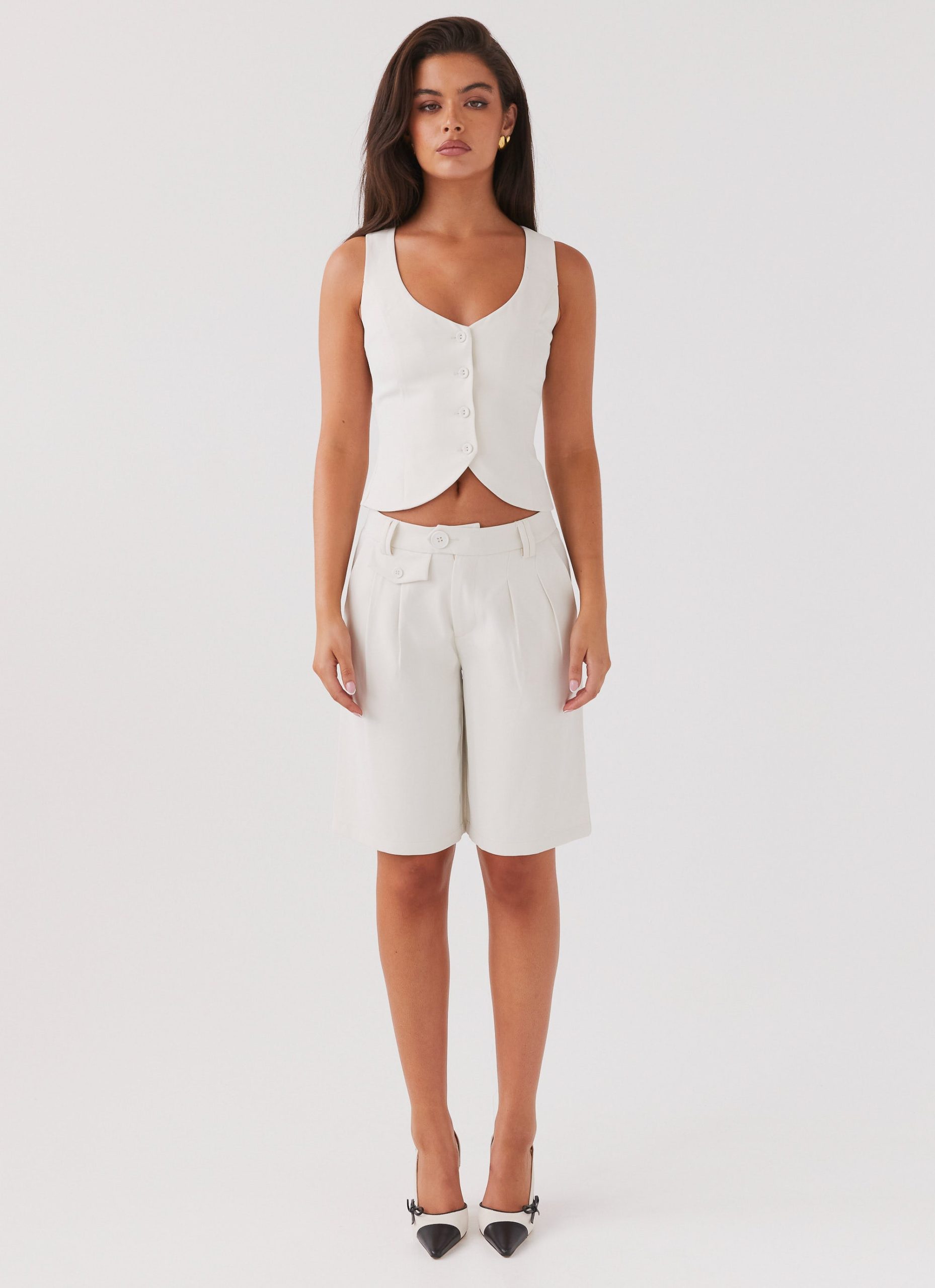 Elevate your wardrobe with the Tammy Suiting Vest. Featuring a chic scoop neckline and front button closures. Pair it with the Tammy Suiting Jorts for an effortlessly cool look and elevate your style from sunset to nightclub silhouettes with this versatile wardrobe essential.