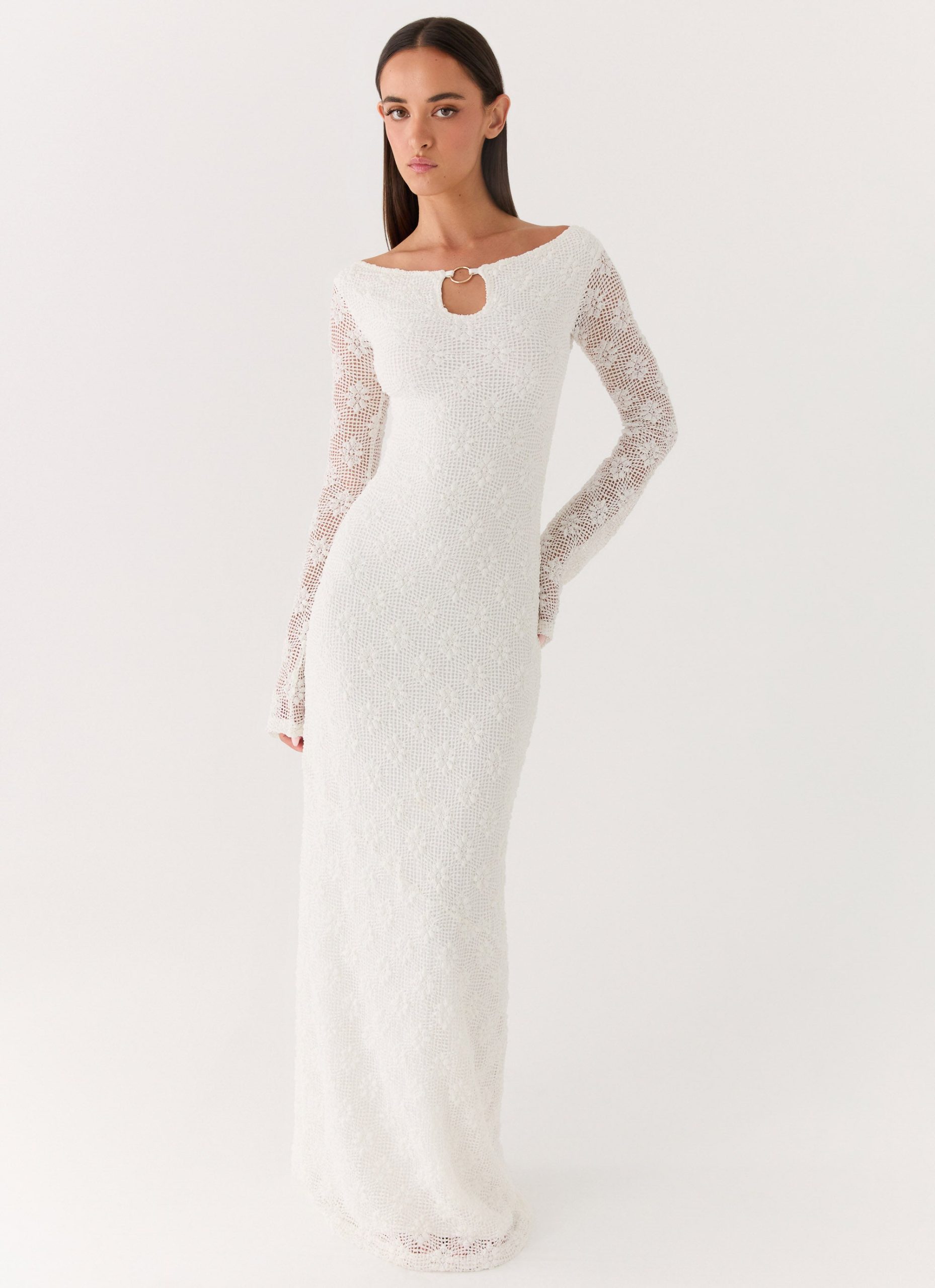 The Theresea Maxi Dress features a sleek maxi length. a front keyhole detail. and striking front gold hardware. Crafted from a textured stretch fabric in a slip – on silhouette. this dress is designed to highlight the form while providing effortless movement.