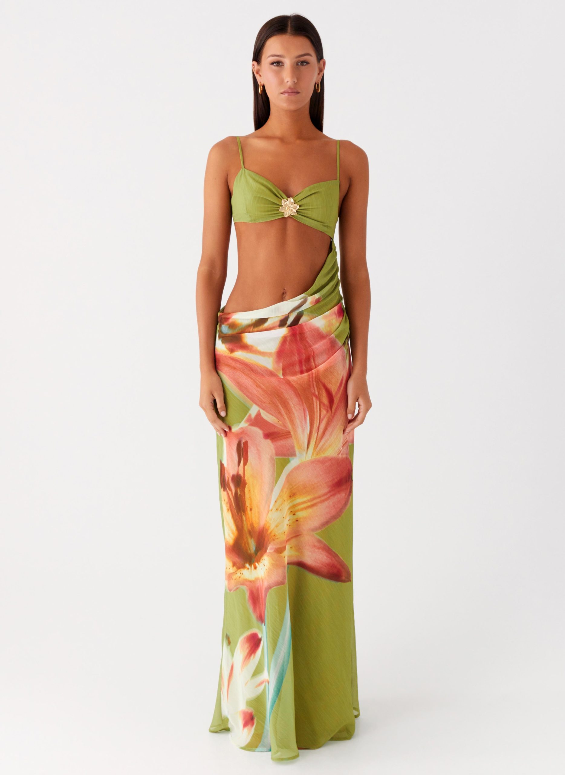 The Tropic Rush Cut Out Maxi Dress is made to dazzle from sunset to starlit nights. Featuring a sweetheart neckline and daring side cut-outs. this maxi silhouette is elevated with ruched sides and a delicate front flower metal embellishment. Finished with thin adjustable straps and a back tie. it’s your ultimate escape-ready dress.