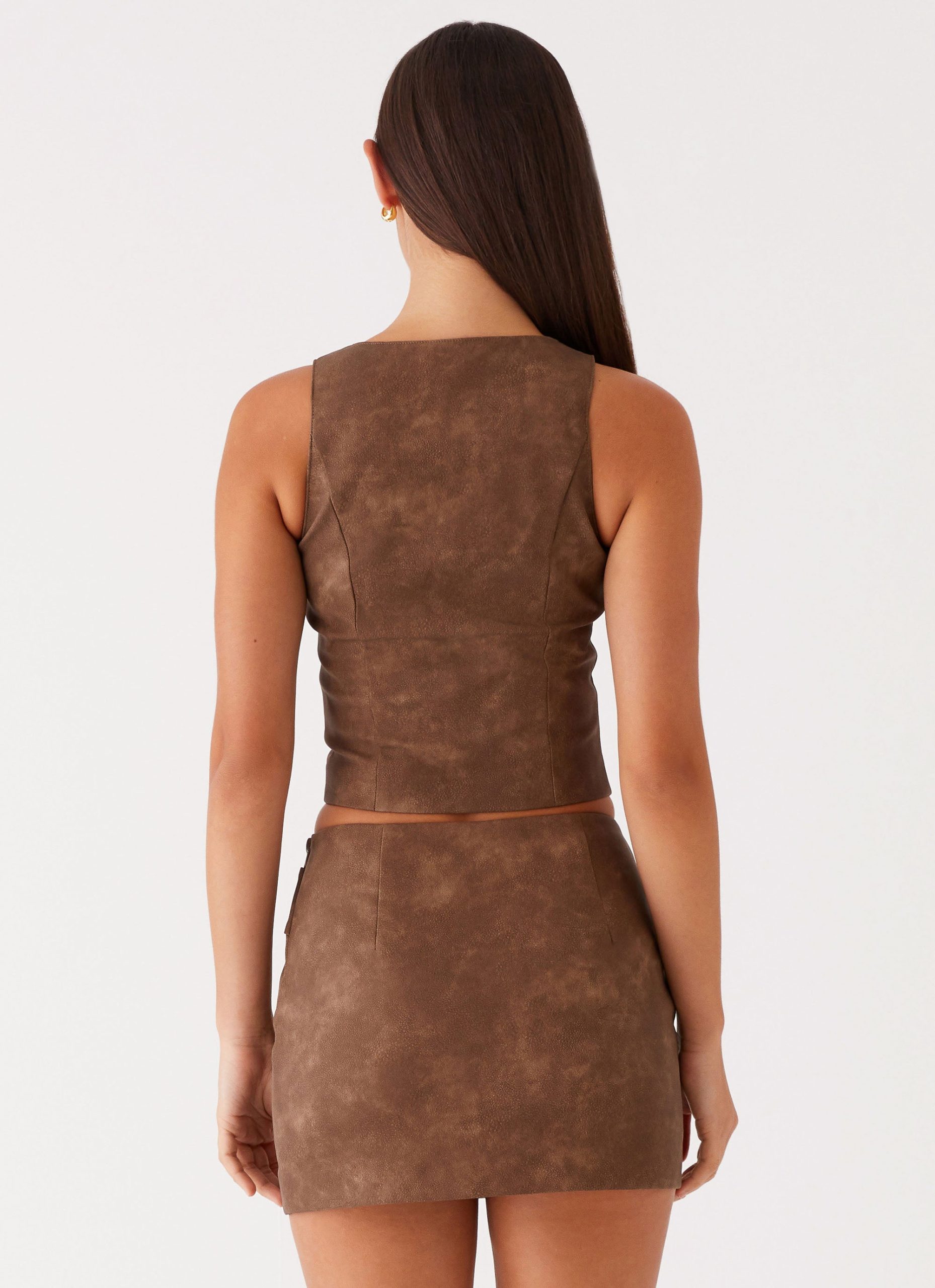 Discover the essence of urban chic with the West District PU Top. This fully panelled. cropped V-neck top features thick straps and a sleek button-down center front design.