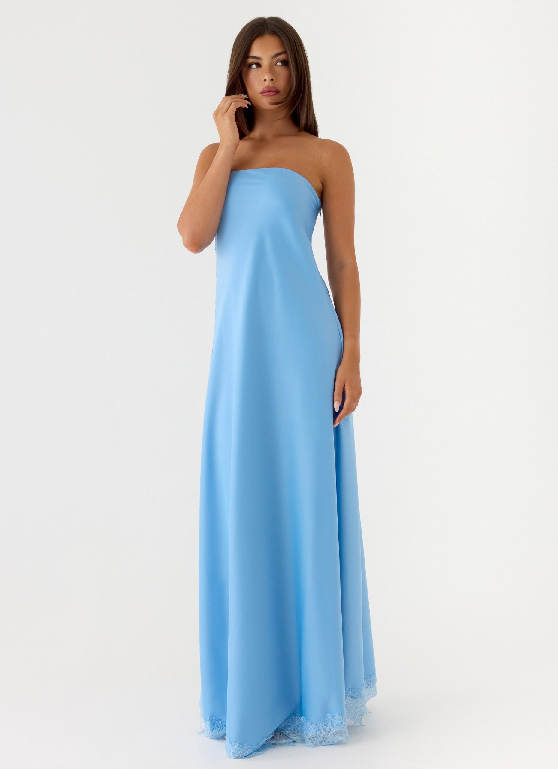 The Yanina Strapless Maxi Dress is made for sunset statements and balmy night affairs. Designed in a sleek strapless silhouette. this bias cut style skims the body before falling into a dramatic maxi length. Finished with delicate lace trim at the hem. it’s a confident.