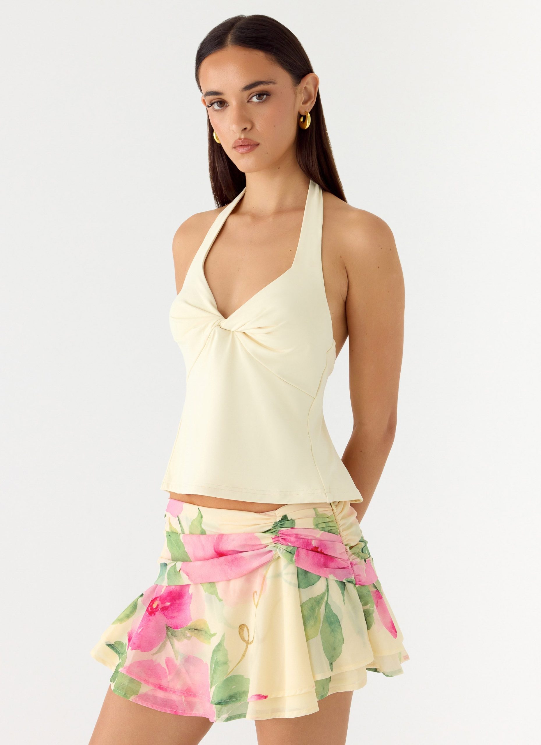 The Yuju Mini Skirt is made for golden hour moments that turn into long. balmy nights. Designed with a low-rise fit and a statement mini length. this silhouette is elevated by twist ruching detailing that hugs in all the right places. Crafted in an exclusive print. it’s a confident after-dark piece with effortless movement.